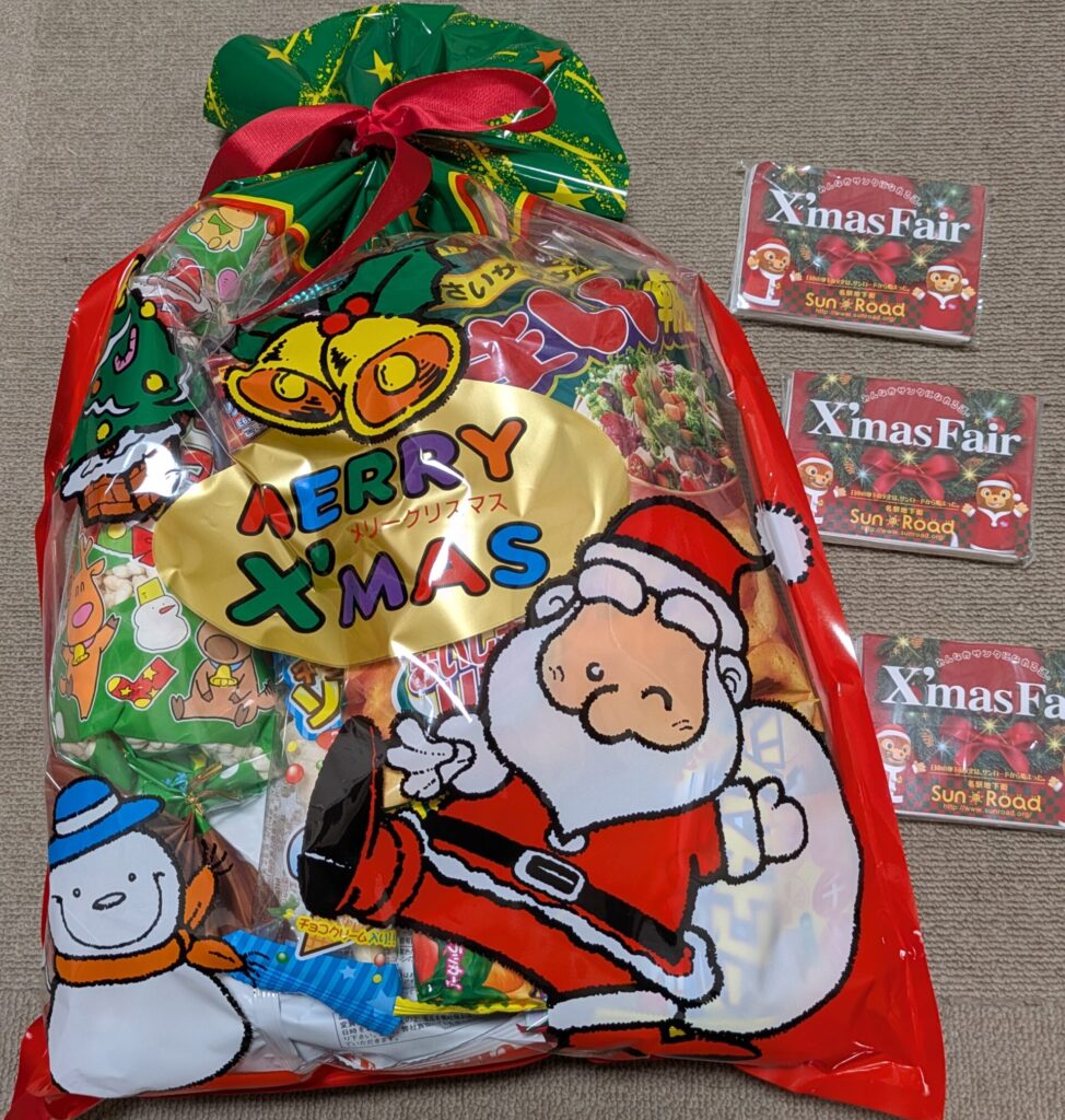 中身は子ども向けの駄菓子がいっぱいでしたが、それもまた「クリスマスお菓子(大)」という名に偽りなし(笑)。そして残念賞のティッシュも、しっかりクリスマス仕様。